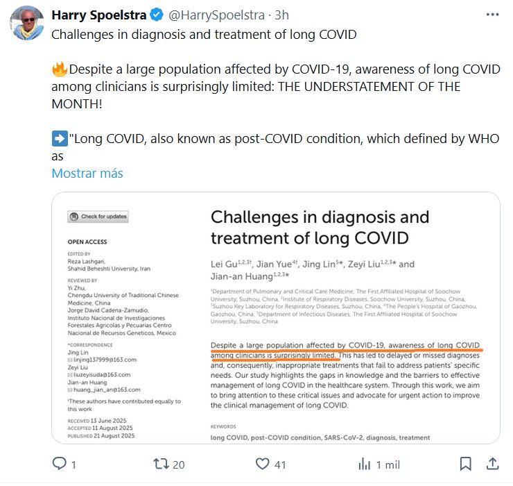 Desafíos en el diagnóstico y tratamiento de la COVID prolongada A pesar de que existe una gran población afectada por COVID-19, el conocimiento sobre la COVID prolongada entre los médicos es sorprendentemente limitado: ¡LA SUBESTIMADA DEL MES! "La COVID prolongada, también conocida como enfermedad pos-COVID, definida por la OMS como la persistencia de síntomas durante al menos dos meses, que generalmente comienzan dentro de los tres meses posteriores a una infección confirmada o probable por SARS-CoV-2 y que no puede explicarse por otra afección, se ha convertido en un importante problema de salud pública a nivel mundial". "Una encuesta a gran escala realizada por Qin et al. encontró que aproximadamente entre el 10 % y el 30 % de los participantes chinos experimentaron síntomas persistentes después de la infección por SARS-CoV-2, incluidos fatiga, deterioro de la memoria, reducción de la capacidad de ejercicio, tos o expectoración, sed, alteraciones del sueño y confusión mental". "Además, una revisión sistemática y un metanálisis estimaron que casi el 50% de los pacientes con COVID-19 en China podrían sufrir de COVID prolongada". "Una síntesis de 144 estudios estimó una prevalencia global combinada de COVID prolongada en un 36%, con variación regional observada: Asia, 35%; Europa, 39%; América del Norte, 30%; y América del Sur, 51%". "Otro metanálisis de 16 estudios informó una prevalencia global combinada más alta del 41,79%, con estimaciones regionales que oscilaron entre el 46,28% en Europa, el 46,29% en América, el 49,79% en Asia y el 42,41% en Australia". "Sin embargo, los estudios existentes tienden a enfatizar la prevalencia en lugar de los desafíos urgentes de la identificación temprana, el diagnóstico oportuno y el manejo clínico". Hacemos un llamado a la comunidad médica para que tome medidas concretas para abordar la COVID prolongada. "En primer lugar, reconocerla como una entidad clínica legítima de acuerdo con la OMS y mejorar la capacitación de los profesionales de la salud mediante programas de educación médica continua, casos clínicos estandarizados y herramientas de apoyo a la toma de decisiones clínicas que apunten a mejorar el reconocimiento temprano y el manejo de la COVID prolongada". "Además, se deberían desarrollar criterios diagnósticos estandarizados y biomarcadores fiables". "Y, sobre todo, los proveedores de atención sanitaria deben adoptar modelos de atención integrales y centrados en el paciente, que incluyan clínicas multidisciplinarias y terapias tradicionales respaldadas por evidencia". "Al escuchar a los pacientes y asumir la complejidad de la COVID prolongada, podemos brindar una atención más eficaz y restaurar la calidad de vida de millones de afectados en todo el mundo". ¡Sólo puedo respaldar este artículo!
