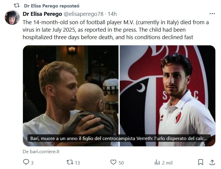 PREGUNTA COVIDIOTA: QUÉ VIRUS SERÍA? Dra. Elisa Perego @elisaperego78 El hijo de 14 meses del futbolista M.V. (actualmente en Italia) falleció a causa de un virus a finales de julio de 2025, según informó la prensa. El niño había estado hospitalizado tres días antes de su fallecimiento y su estado de salud se deterioró rápidamente.
