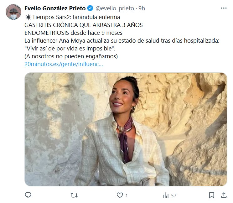 DR. Evelio González Prieto @evelio_prieto · ✴️Tiempos Sars2: farándula enferma GASTRITIS CRÓNICA QUE ARRASTRA 3 AÑOS ENDOMETRIOSIS desde hace 9 meses La influencer Ana Moya actualiza su estado de salud tras días hospitalizada: «Vivir así de por vida es imposible». (A nosotros no pueden engañarnos)