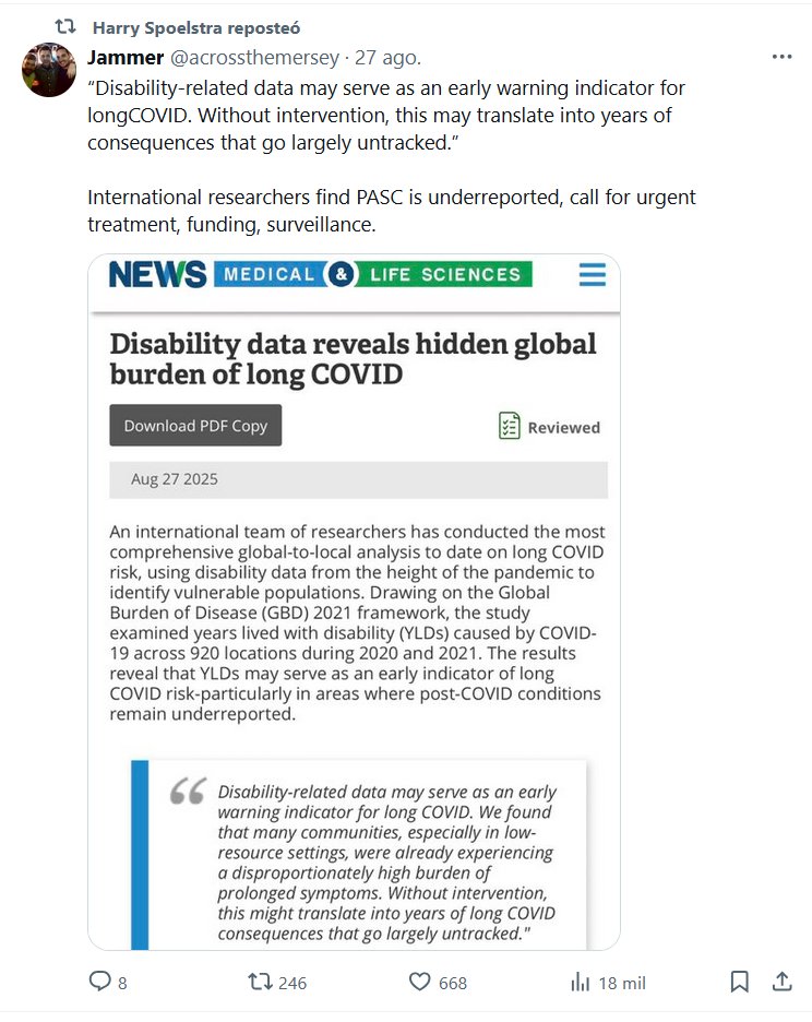 El Dr. Harry Spoelstra repitió la noticia de Jammer en @acrossthemersey “Los datos relacionados con la discapacidad pueden servir como un indicador de alerta temprana para la COVID-19 persistente. Sin intervención, esto podría traducirse en años de consecuencias que, en gran medida, pasan desapercibidas”. Investigadores internacionales descubren que el PASC está subregistrado y exigen tratamiento, financiación y vigilancia urgentes.