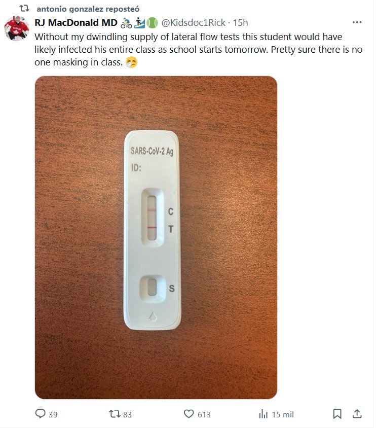 COVID POSITIVO El profesor Antonio González reposteó RJ MacDonald MD 🚴♂️🏄🏻🎾 @Kidsdoc1Rick Sin mi escaso suministro de pruebas de flujo lateral, este estudiante probablemente habría infectado a toda su clase, ya que las clases comienzan mañana. Estoy bastante seguro de que nadie usa mascarilla en clase. 🤧
