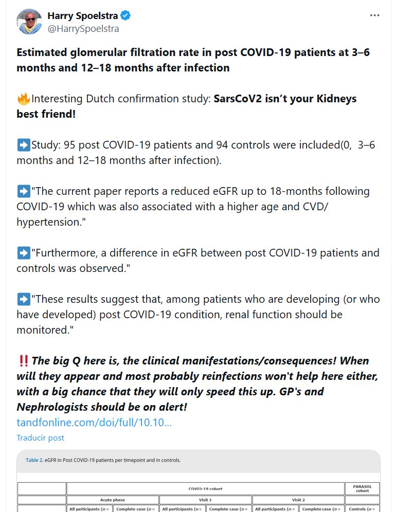 Dr. Harry Spoelstra @HarrySpoelstra Tasa de filtración glomerular estimada en pacientes con COVID-19 a los 3-6 meses y a los 12-18 meses después de la infección 🔥Interesante estudio holandés de confirmación: ¡El SARS-CoV-2 no es el mejor amigo de tus riñones!