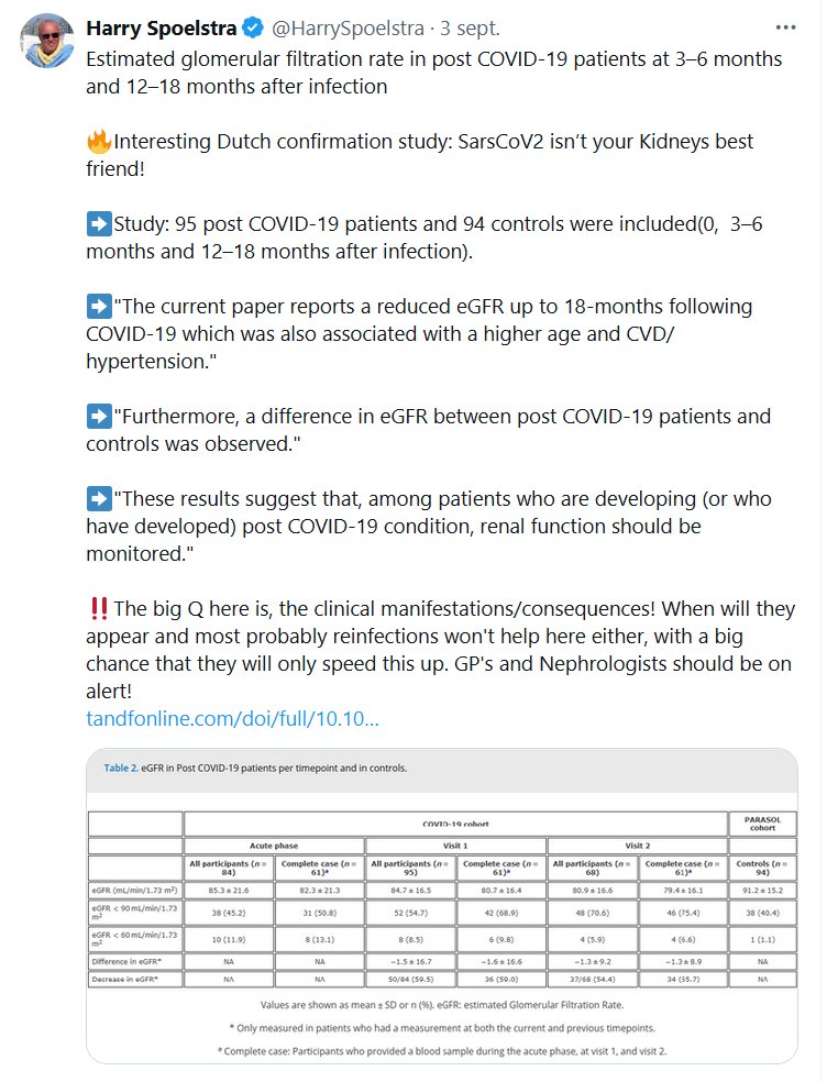 DR. Harry Spoelstra @HarrySpoelstra Tasa de filtración glomerular estimada en pacientes con COVID-19 a los 3-6 meses y a los 12-18 meses después de la infección 🔥Interesante estudio holandés de confirmación: ¡El SARS-CoV-2 no es el mejor amigo de tus riñones!
