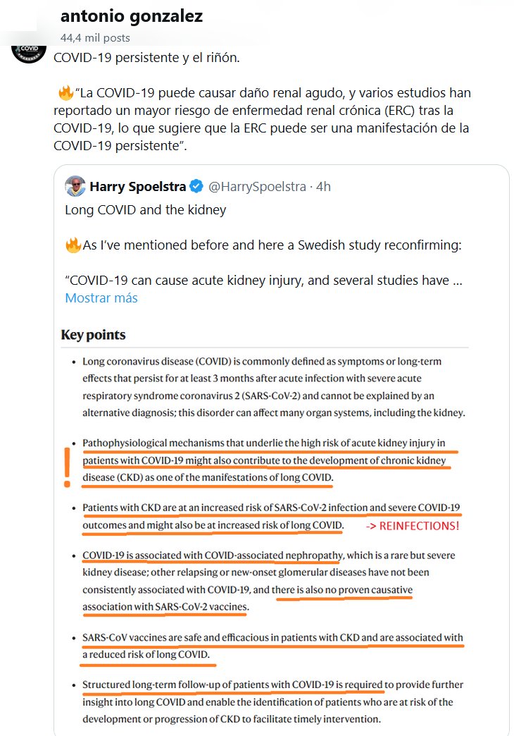 Prof. Antonio González @poetricus2 · COVID-19 persistente y el riñón. 🔥“La COVID-19 puede causar daño renal agudo, y varios estudios han reportado un mayor riesgo de enfermedad renal crónica (ERC) tras la COVID-19, lo que sugiere que la ERC puede ser una manifestación de la COVID-19 persistente”