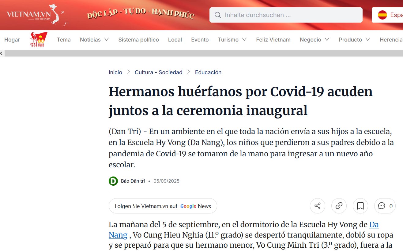 Vietnam.vn > Hermanos huérfanos por Covid-19 acuden juntos a la ceremonia inaugural Posted on septiembre 5, 2025 por coronado https://www.vietnam.vn/es/anh-em-mo-coi-vi-covid-19-cung-dat-nhau-di-khai-giang