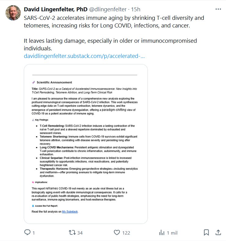 David Lingenfelter, PhD @dlingenfelter El SARS-CoV-2 acelera el envejecimiento inmunitario al reducir la diversidad de células T y los telómeros, lo que aumenta el riesgo de COVID persistente, infecciones y cáncer. Deja daños duraderos, especialmente en personas mayores o inmunodeprimidas.