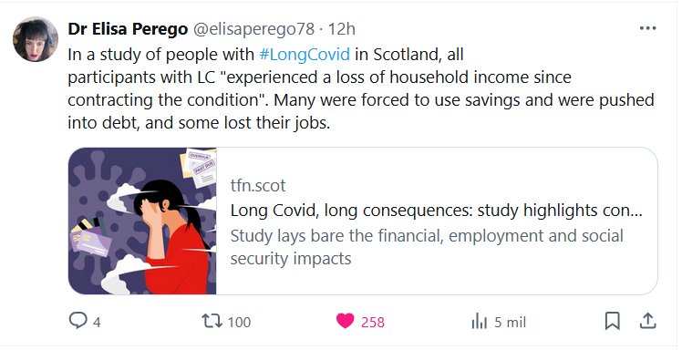 Dra. Elisa Perego @elisaperego78 En un estudio con personas con #CovidPersistente en Escocia, todos los participantes con LC experimentaron una pérdida de ingresos familiares desde que contrajeron la enfermedad. Muchos se vieron obligados a usar sus ahorros y se endeudaron, y algunos perdieron sus empleos.