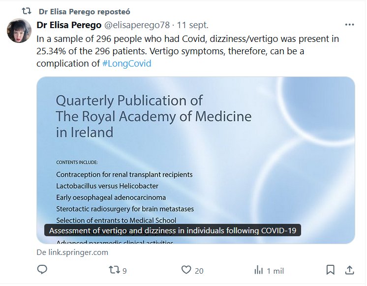 Dra. Elisa Perego @elisaperego78 En una muestra de 296 personas con COVID-19, el 25,34 % de los pacientes presentó mareos o vértigo. Por lo tanto, los síntomas de vértigo pueden ser una complicación de la #CovidPersistente