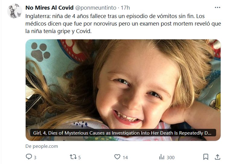 LESA HUMANIDAD No Mires Al Covid @ponmeuntinto · 17h Inglaterra: niña de 4 años fallece tras un episodio de vómitos sin fin. Los médicos dicen que fue por norovirus pero un examen post mortem reveló que la niña tenía gripe y Covid.