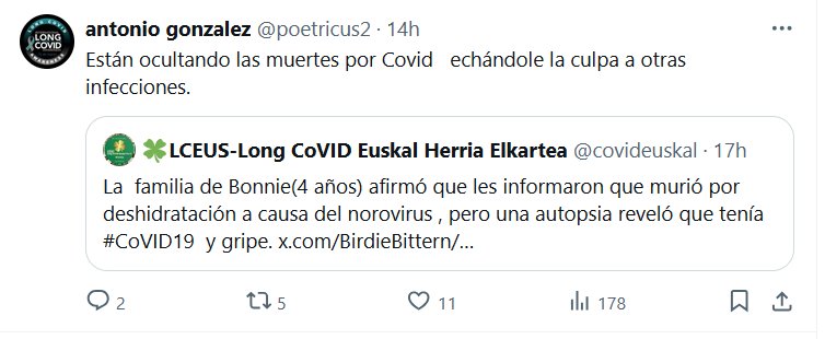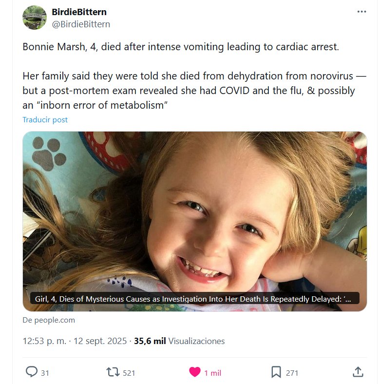 TESTIMONIOS Prof. Antonio González @poetricus2 · Están ocultando las muertes por Covid echándole la culpa a otras infecciones. Cita 🍀LCEUS-Long CoVID Euskal Herria Elkartea @covideuskal · 17h La familia de Bonnie(4 años) afirmó que les informaron que murió por deshidratación a causa del norovirus , pero una autopsia reveló que tenía #CoVID19 y gripe
