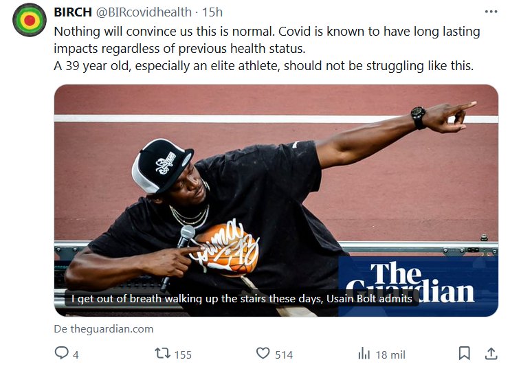 ESCUCHO VOCES: BIRCH @BIRcovidhealth Nada nos convencerá de que esto sea normal. Se sabe que la COVID-19 tiene consecuencias duraderas, independientemente del estado de salud previo. Una persona de 39 años, especialmente un atleta de élite, no debería estar pasando por esto. «Usain Bolt admite: últimamente me quedo sin aliento al subir las escaleras»