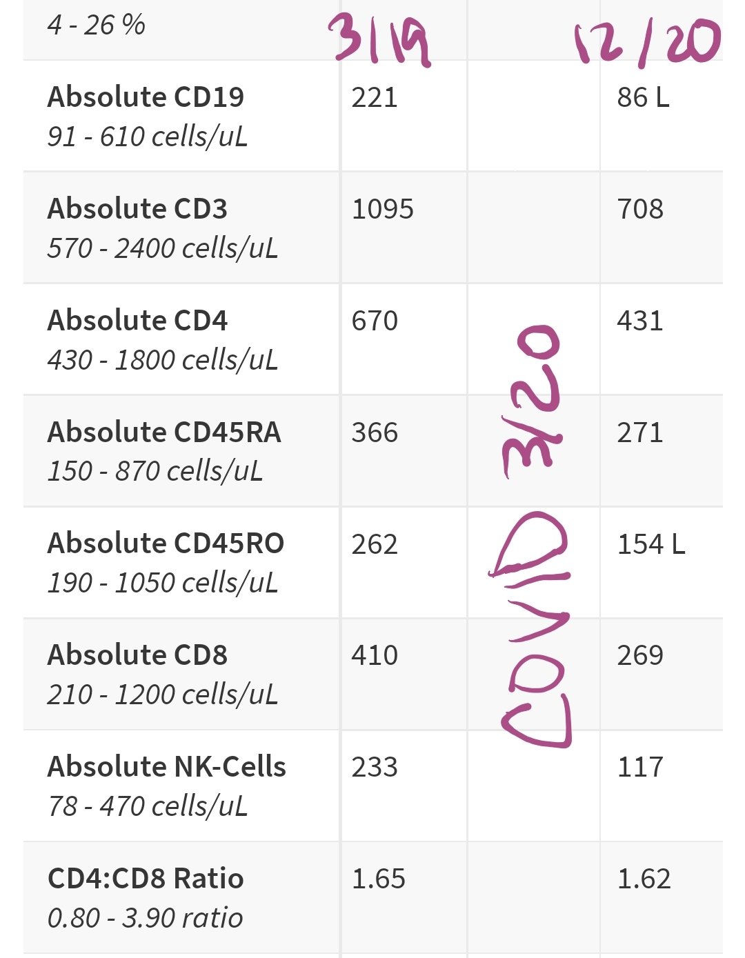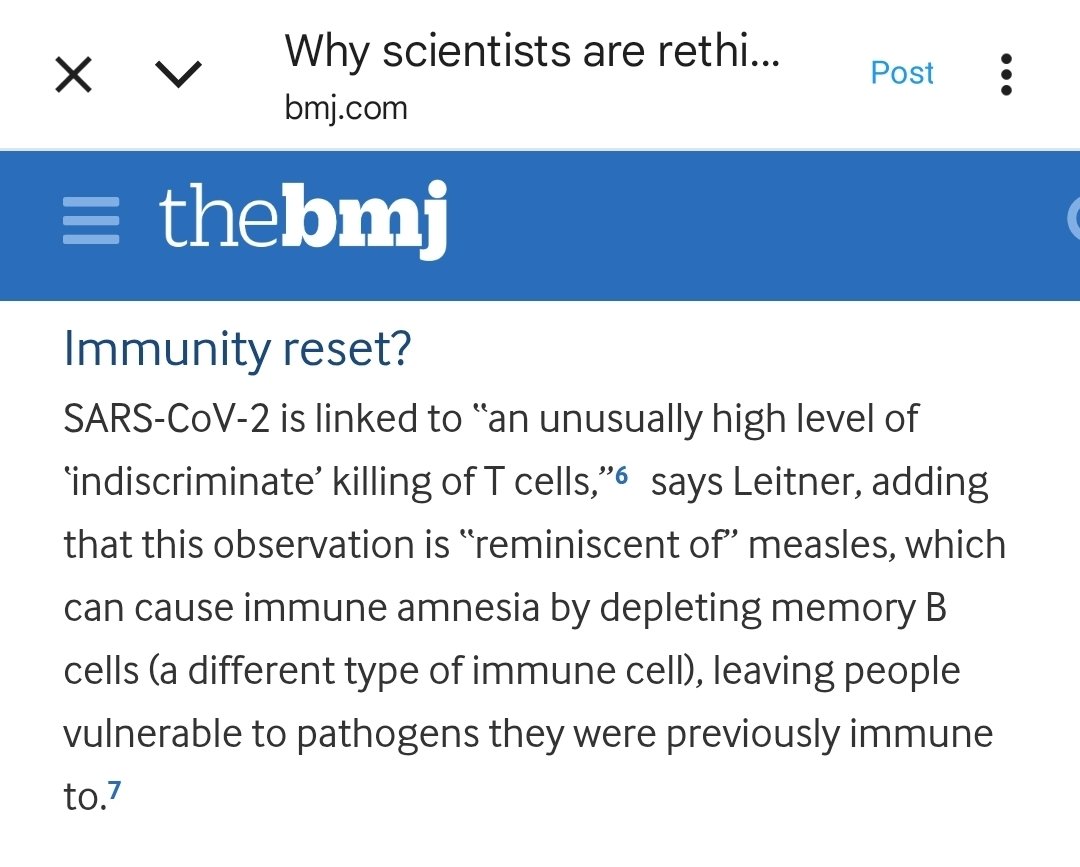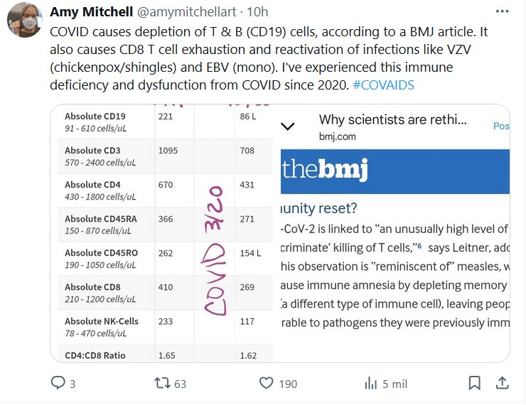 Amy Mitchell @amymitchellart Según un artículo del BMJ, la COVID-19 causa una disminución de las células T y B (CD19). También provoca el agotamiento de las células T CD8 y la reactivación de infecciones como el virus de la varicela/herpes zóster y el virus de Epstein-Barr (mononucleosis). He experimentado esta deficiencia y disfunción inmunitaria a causa de la COVID-19 desde 2020. #COVSIDA