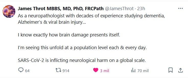 James Throt, MBBS, MD, PhD, FRCPath @JamesThrot Como neuropatólogo con décadas de experiencia en el estudio de la demencia, el Alzheimer y las lesiones cerebrales virales… Sé exactamente cómo se presenta el daño cerebral. Veo cómo se desarrolla a nivel poblacional a diario. El SARS-CoV-2 está causando daño neurológico a escala global.