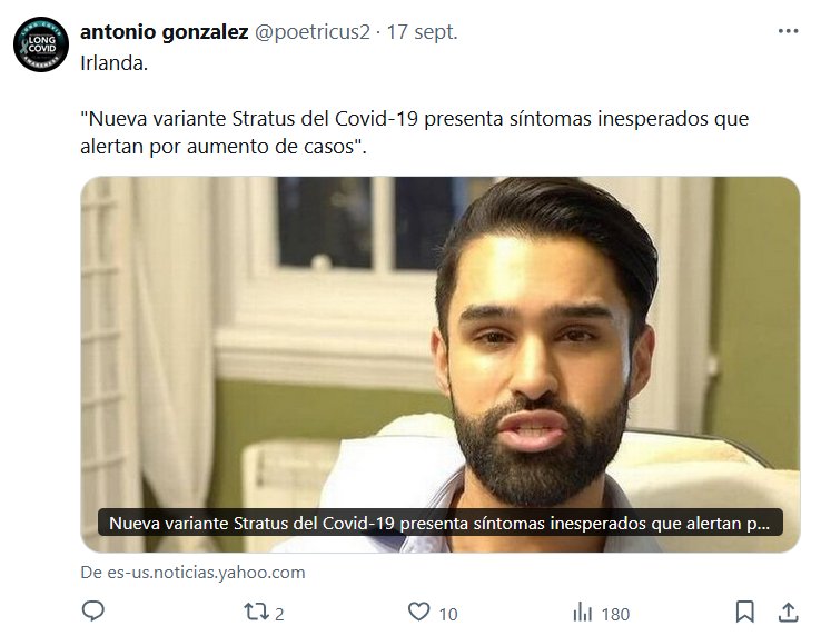 Prof. Antonio González @poetricus2 · Irlanda. «Nueva variante Stratus del Covid-19 presenta síntomas inesperados que alertan por aumento de casos». Posted on septiembre 19, 2025 por coronado https://es-us.noticias.yahoo.com/variante-stratus-covid-19-presenta-153829779.html