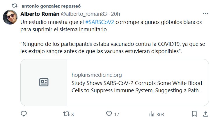 Prof. Antonio González reposteó a Alberto Román @alberto_roman83 · Un estudio muestra que el #SARSCoV2 corrompe algunos glóbulos blancos para suprimir el sistema inmunitario. “Ninguno de los participantes estaba vacunado contra la COVID19, ya que se les extrajo sangre antes de que las vacunas estuvieran disponibles”