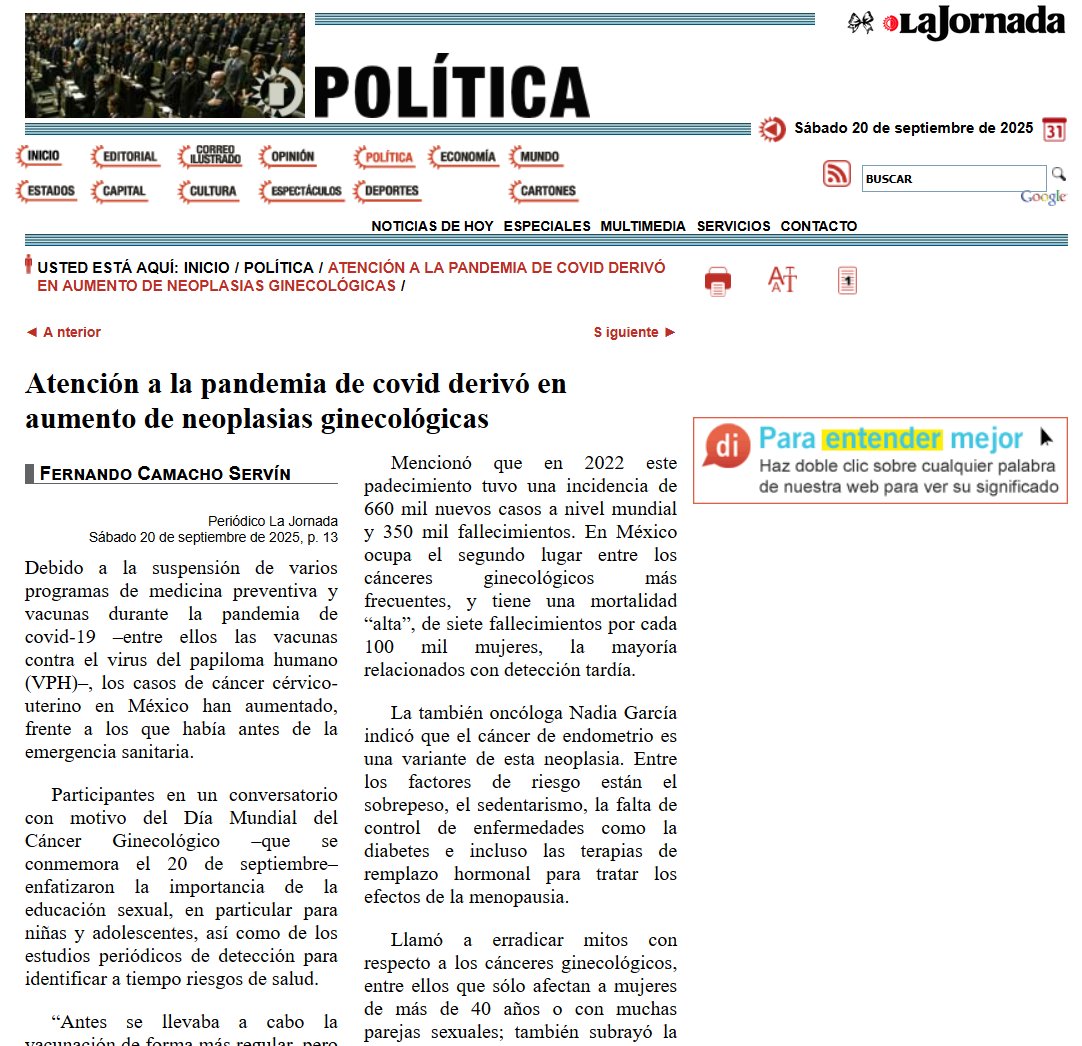 Atención a la pandemia de covid : derivó en aumento de neoplasias ginecológicas Posted on septiembre 20, 2025 por coronado https://www.jornada.com.mx/2025/09/20/politica/013n2pol