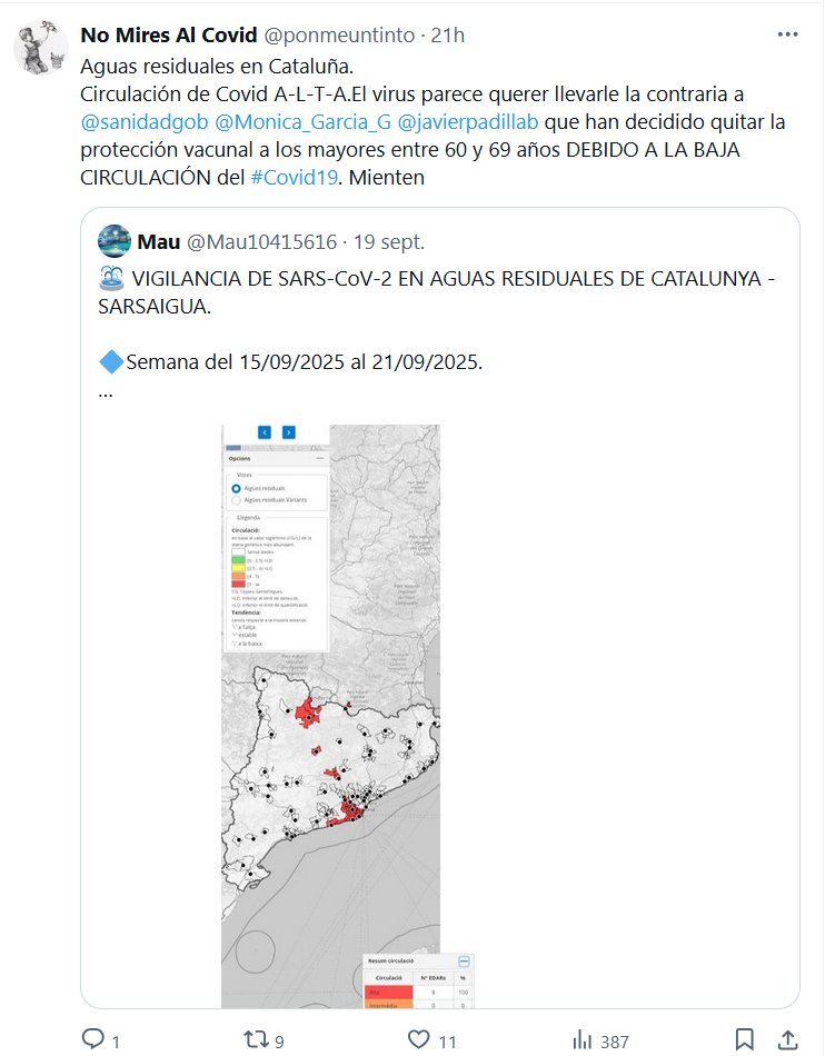 No Mires Al Covid @ponmeuntinto · 21h Aguas residuales en Cataluña. Circulación de Covid A-L-T-A.El virus parece querer llevarle la contraria a @sanidadgob @Monica_Garcia_G @javierpadillab que han decidido quitar la protección vacunal a los mayores entre 60 y 69 años DEBIDO A LA BAJA CIRCULACIÓN del #Covid19. Mienten