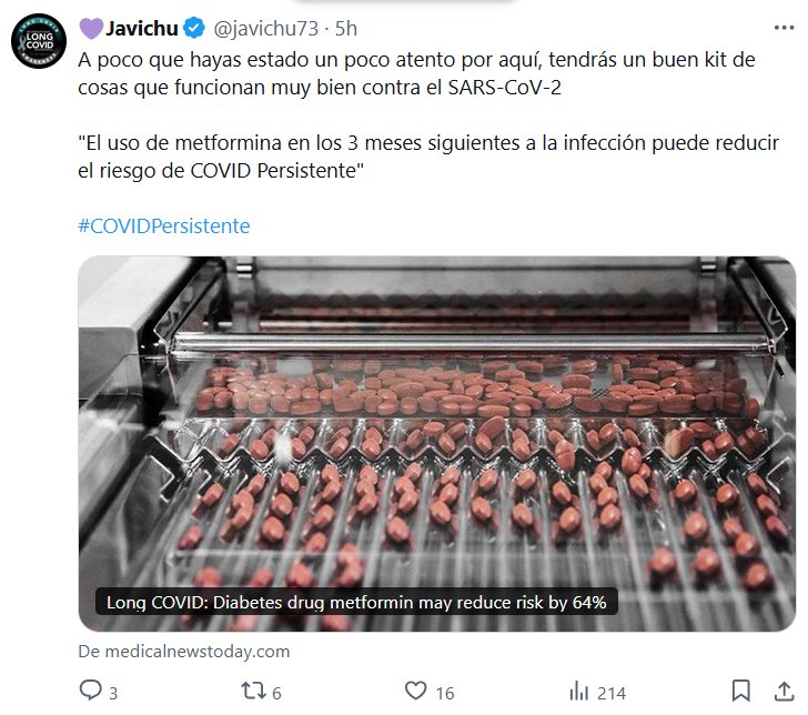 💜Javichu @javichu73 · A poco que hayas estado un poco atento por aquí, tendrás un buen kit de cosas que funcionan muy bien contra el SARS-CoV-2 «El uso de metformina en los 3 meses siguientes a la infección puede reducir el riesgo de COVID Persistente»