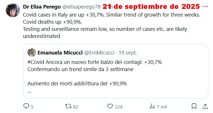 21 DE SEPTIEMBRE DE 2025 «FIN DE PANDEMIA» Dra. Elisa Perego @elisaperego78 Los casos de COVID en Italia han aumentado un 30,7 %. Tendencia de crecimiento similar durante tres semanas. Las muertes por COVID han aumentado un 90,9 %. Las pruebas y la vigilancia siguen siendo bajas, por lo que es probable que el número de casos, etc., esté subestimado.
