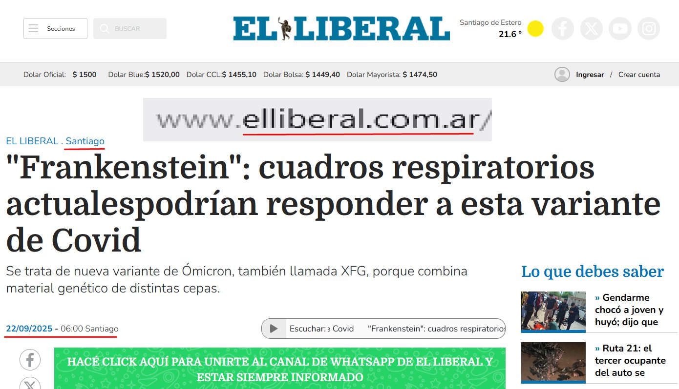 SANTIAGO DEL ESTERO, ARGENTINA «Frankenstein»: cuadros respiratorios actuales podrían responder a esta variante de Covid Se trata de nueva variante de Ómicron, también llamada XFG, porque combina material genético de distintas cepas