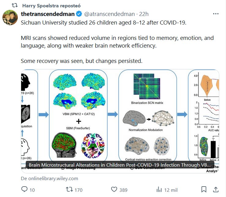 «ES LEVE», DECÍAN El Dr. Harry Spoelstra reposteó a thetranscendedman @atranscendedman La Universidad de Sichuan estudió a 26 niños de 8 a 12 años después de la COVID-19. Las resonancias magnéticas mostraron una reducción del volumen en las regiones relacionadas con la memoria, las emociones y el lenguaje, junto con una menor eficiencia de la red cerebral. Se observó cierta recuperación, pero los cambios persistieron.