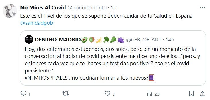 MUNDO COVIDIOTA: TESTIMONIOS No Mires Al Covid @ponmeuntinto · Este es el nivel de los que se supone deben cuidar de tu Salud en España @sanidadgob Cita DENTRO_MADRID🥑🥝🍌🥦🥬🍇 @CER_OF_AUT · Hoy, dos enfermeros estupendos, dos soles, pero…en un momento de la conversación al hablar de covid persistente me dice uno de ellos…»pero…y entonces cada vez que te haces un test das positivo»? eso es el covid persistente? @HMHOSPITALES , no podrían formar a los nuevos?🧵