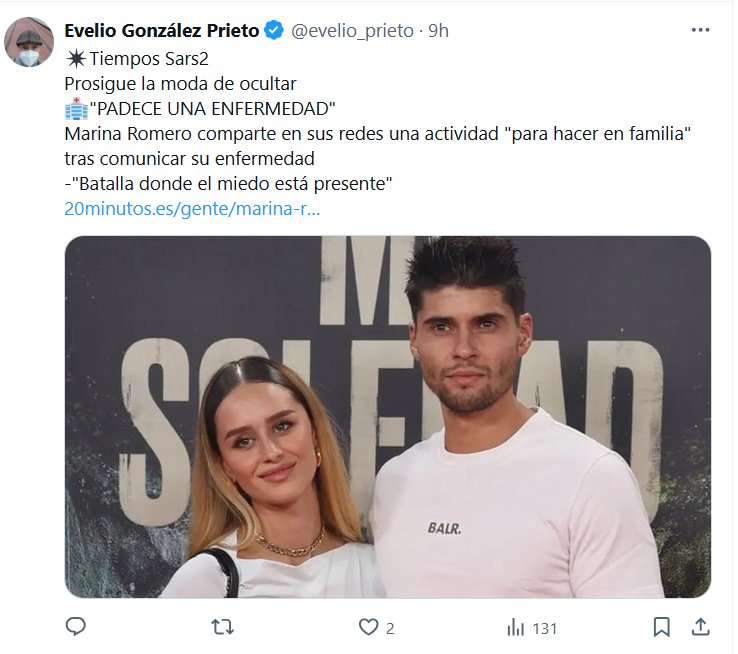NODIGAMOSCOVID HACE ESTRAGOS Evelio González Prieto @evelio_prieto · ✴️Tiempos Sars2 Prosigue la moda de ocultar 🏥»PADECE UNA ENFERMEDAD» Marina Romero comparte en sus redes una actividad «para hacer en familia» tras comunicar su enfermedad -«Batalla donde el miedo está presente»