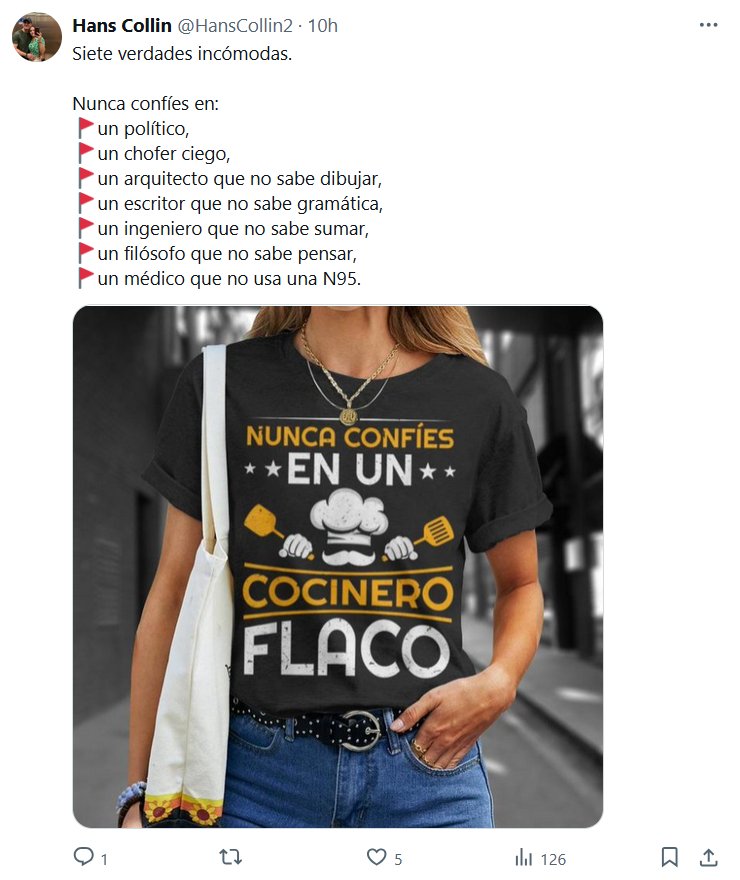 Hans Collin @HansCollin2 · 10h Siete verdades incómodas. Nunca confíes en: 🚩un político, 🚩un chofer ciego, 🚩un arquitecto que no sabe dibujar, 🚩un escritor que no sabe gramática, 🚩un ingeniero que no sabe sumar, 🚩un filósofo que no sabe pensar, 🚩un médico que no usa una N95.