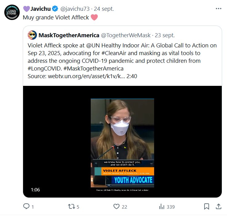 💜Javichu @javichu73 · 24 sept. ¡Muy bien, Violet Affleck! 🩷 Cita MaskTogetherAmerica @TogetherWeMask · 23 sept. Violet Affleck habló en @UN Healthy Indoor Air: A Global Call to Action el 23 de septiembre de 2025, abogando por el #AireLimpio y el uso de mascarillas como herramientas vitales para abordar la pandemia de COVID-19 y proteger a los niños de la #COVIDPersistente. #MaskTogetherAmerica