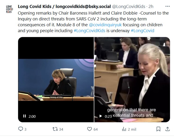 Niños con Covid Persistente / longcovidkids@bsky.social @LongCovidKids · Palabras de apertura a cargo de la presidenta, la baronesa Hallett, y Claire Dobbie, asesora de la investigación sobre las amenazas directas del SARS-CoV-2, incluyendo sus consecuencias a largo plazo. El módulo 8 de la @covidinquiryuk, centrado en niños y jóvenes, incluyendo a los niños con Covid-19 prolongados, está en marcha. #LongCovid