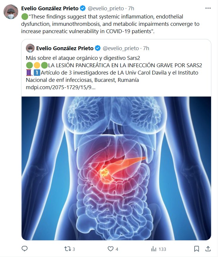 DR. Evelio González Prieto @evelio_prieto · 🟢»Estos hallazgos sugieren que la inflamación sistémica, la disfunción endotelial, la inmunotrombosis y las alteraciones metabólicas convergen para aumentar la vulnerabilidad pancreática en pacientes con COVID-19″.