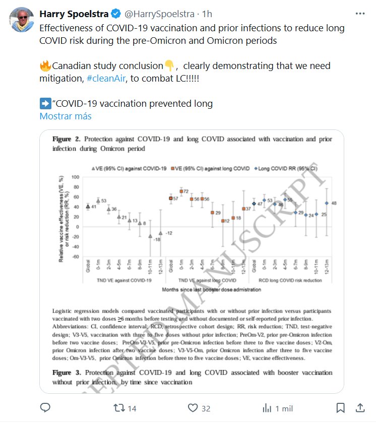 DR. Harry Spoelstra @HarrySpoelstra · Eficacia de la vacunación contra la COVID-19 y las infecciones previas para reducir el riesgo de COVID prolongada durante los períodos pre-Ómicron y Ómicron 🔥Conclusión del estudio canadiense👇, que demuestra claramente que necesitamos mitigación, #AireLimpio, para combatir la LC.