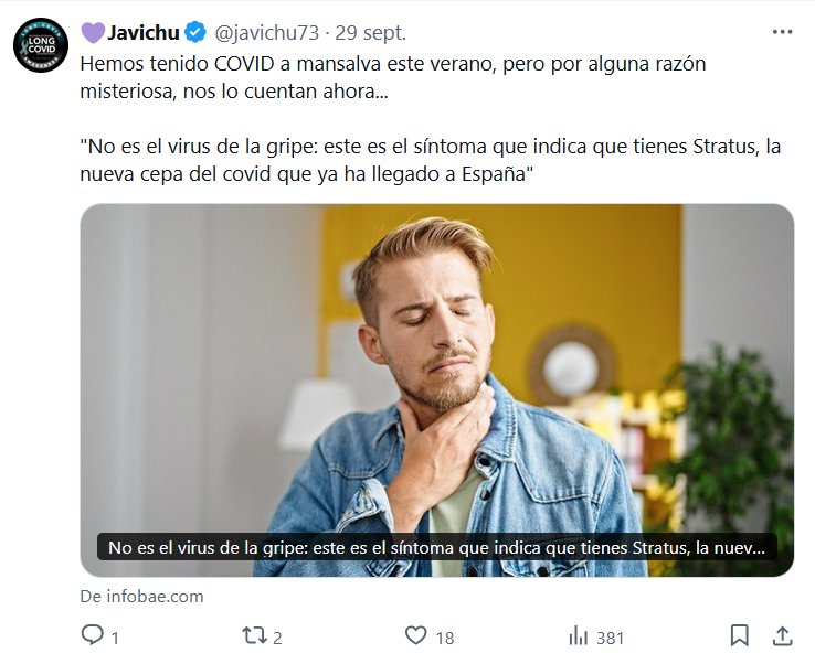 OMERTÁ COVID 💜Javichu @javichu73 · 29 sept. Hemos tenido COVID a mansalva este verano, pero por alguna razón misteriosa, nos lo cuentan ahora… «No es el virus de la gripe: este es el síntoma que indica que tienes Stratus, la nueva cepa del covid que ya ha llegado a España»