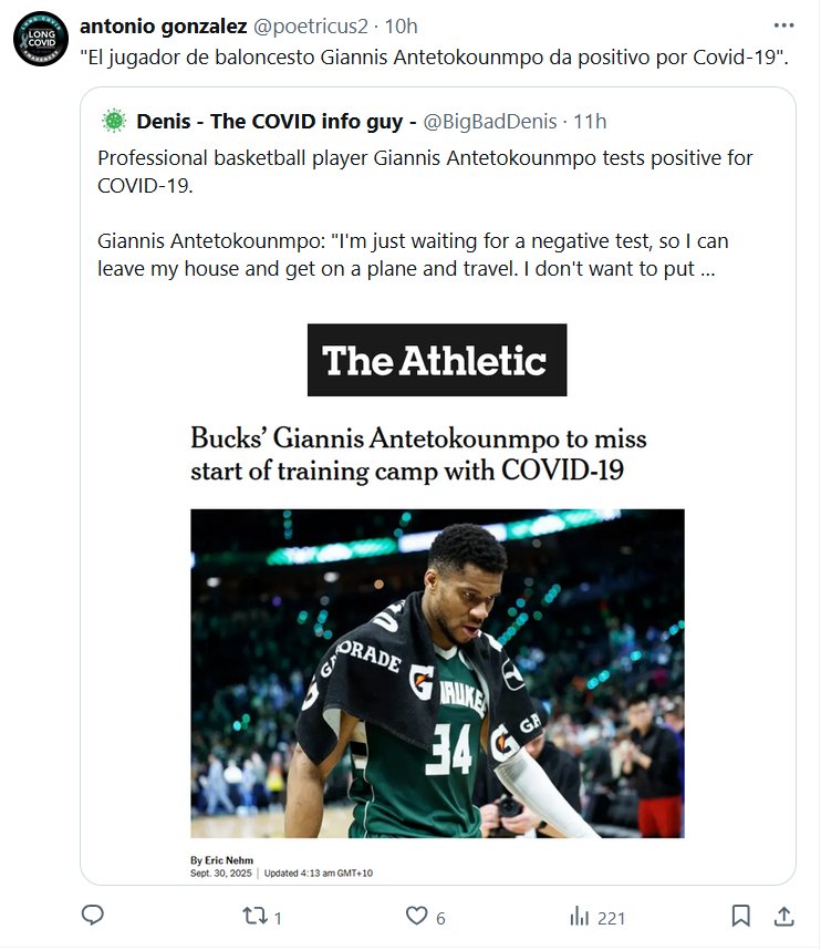 Prof. Antonio González @poetricus2 · «El jugador de baloncesto Giannis Antetokounmpo da positivo por Covid-19»