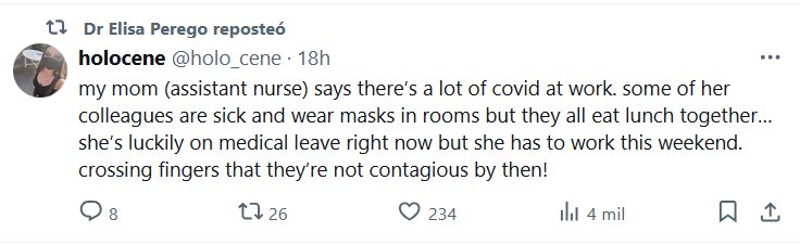 TESTIMONIOS La Dra. Elisa Perego repostó holocene @holo_cene · Mi madre (auxiliar de enfermería) dice que hay mucho COVID en el trabajo. Algunos de sus compañeros están enfermos y usan mascarillas en las habitaciones, pero todos comen juntos… Por suerte, ahora está de baja médica, pero tiene que trabajar este fin de semana. ¡Crucemos los dedos para que no sean contagiosos para entonces!