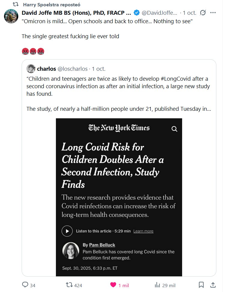 “Los niños y adolescentes tienen el doble de probabilidades de desarrollar #LongCovid después de una segunda infección por coronavirus que después de una infección inicial, según ha descubierto un nuevo estudio a gran escala. El estudio, de casi medio millón de personas menores de 21 años, publicado el martes en Lancet Infectious Diseases”