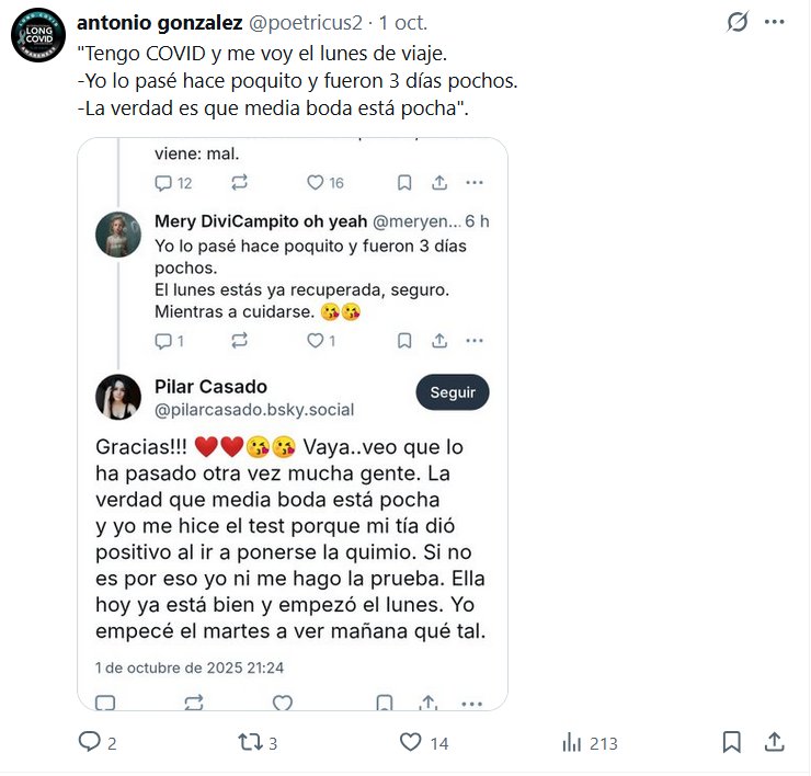 TESTIMONIOS Prof. Antonio González @poetricus2 · 1 oct. «Tengo COVID y me voy el lunes de viaje. -Yo lo pasé hace poquito y fueron 3 días pochos. -La verdad es que media boda está pocha». Posted on octubre 3, 2025 por coronado