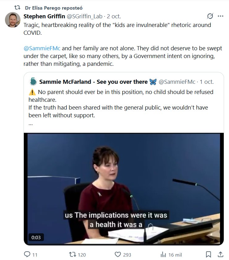 «UN GOBIERNO EMPEÑADO EN IGNORAR, EN LUGAR DE MITIGAR UNA PANDEMIA» La Dra. Elisa Perego repostó Stephen Griffin @SGriffin_Lab · 2 oct. La trágica y desgarradora realidad de la retórica de que «los niños son invulnerables» en torno a la COVID-19. @SammieFMc y su familia no están solos. No merecían ser ignorados, como tantos otros, por un Gobierno empeñado en ignorar, en lugar de mitigar, una pandemia.