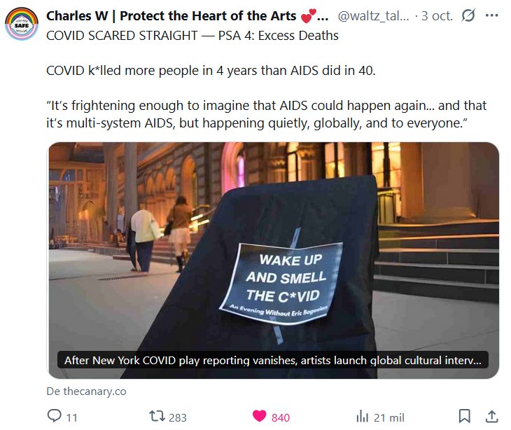 Charles W | Protejamos el corazón de las artes 💕😷 @waltz_tales · EL COVID NOS HA ASUSTADO — PSA 4: Exceso de muertes El COVID ha matado a más personas en 4 años que el sida en 40. «Es bastante aterrador imaginar que el sida podría volver a ocurrir… y que se trata de un sida multisistémico, pero que ocurre de forma silenciosa, a nivel mundial y a todo el mundo»