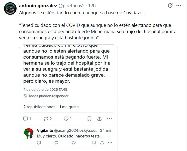 Prof. Antonio González @poetricus2 · Algunos se estén dando cuenta aunque a base de Covidazos. «Tened cuidado con el COVID que aunque no lo estén alertando para que consumamos está pegando fuerte.Mi hermana seo trajo del hospital por ir a ver a su suegra y está bastante jodida»