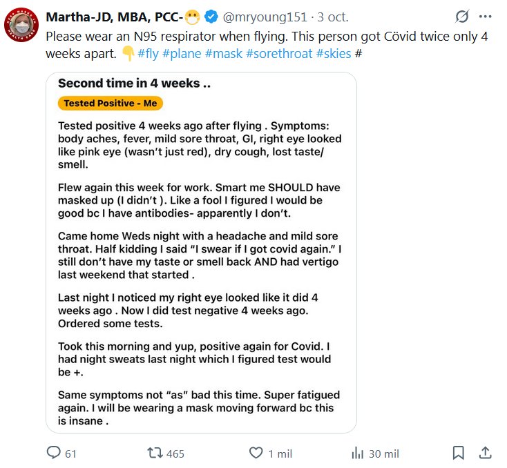 Segunda vez en 4 semanas... Yo di positivo Di positivo hace 4 semanas después de volar. Síntomas: dolores corporales, fiebre, dolor de garganta leve, glaucoma, el ojo derecho parecía conjuntivitis (no solo estaba rojo), tos seca, pérdida del gusto y el olfato. Volé de nuevo esta semana por trabajo. ¡Qué inteligente! ¡Debería haberme puesto mascarilla! (No lo hice). Como un tonto, pensé que estaría bien tener anticuerpos, pero al parecer no los tengo. Llegué a casa el miércoles por la noche con dolor de cabeza y dolor de garganta leve. Medio en broma, dije: "Juro que si vuelvo a tener COVID, me lo voy a decir". Sigo sin recuperar el gusto ni el olfato, y el fin de semana pasado tuve vértigo. Anoche noté que mi ojo derecho tenía el mismo aspecto que hace 4 semanas. Di negativo. Solicité pruebas. Me las hice esta mañana y sí, di positivo otra vez para COVID. Anoche tuve sudores nocturnos, y pensé que la prueba daría positivo. Los mismos síntomas, pero esta vez no tan graves. Estoy muy fatigado otra vez. Usaré mascarilla de ahora en adelante, pero esto es una locura.