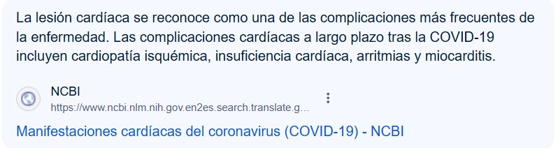 La lesión cardíaca se reconoce como una de las complicaciones más frecuentes de la enfermedad. Las complicaciones cardíacas a largo plazo tras la COVID-19 incluyen cardiopatía isquémica, insuficiencia cardíaca, arritmias y miocarditis.