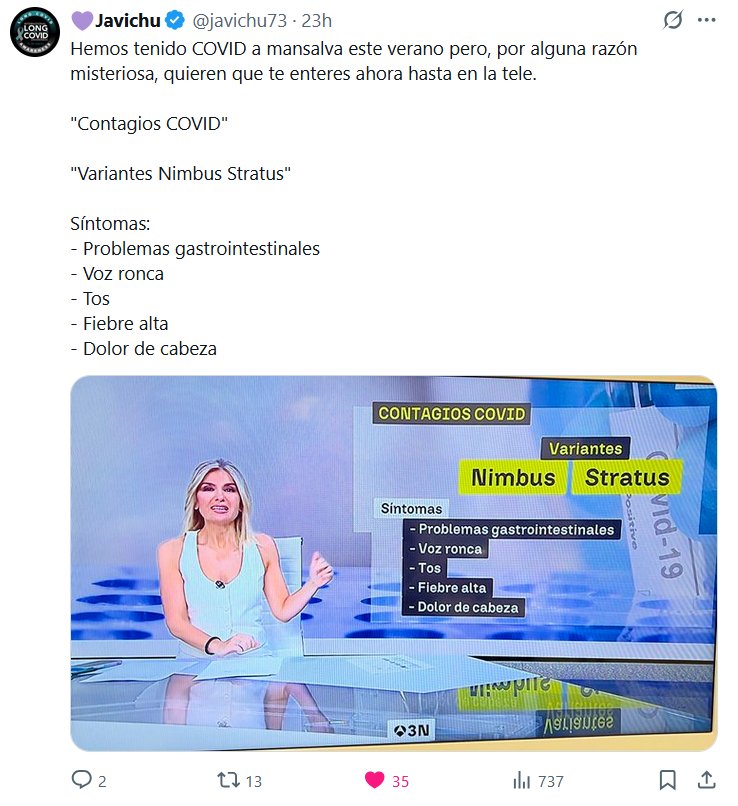 QUE ES ESTO DE PONER SEMÁFORO TRAS EL CHOQUE? QUIEREN ENFERMOS EN VEZ DE PREVENCIÓN? 💜Javichu @javichu73 · Hemos tenido COVID a mansalva este verano pero, por alguna razón misteriosa, quieren que te enteres ahora hasta en la tele. «Contagios COVID» «Variantes Nimbus Stratus» Síntomas: – Problemas gastrointestinales – Voz ronca – Tos – Fiebre alta – Dolor de cabeza