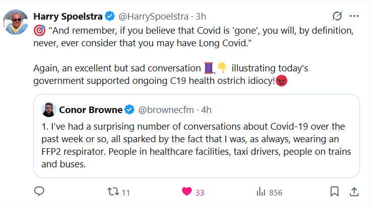 ESCUCHO VOCES DR. Harry Spoelstra @HarrySpoelstra · 🎯 «Y recuerda, si crees que la COVID-19 ya pasó, por definición, nunca jamás considerarás que puedas tener COVID-19 persistente». De nuevo, una conversación excelente, pero triste 🧵👇, que ilustra la actual estupidez sanitaria del avestruz, apoyada por el gobierno, en relación con la COVID-19. 😡