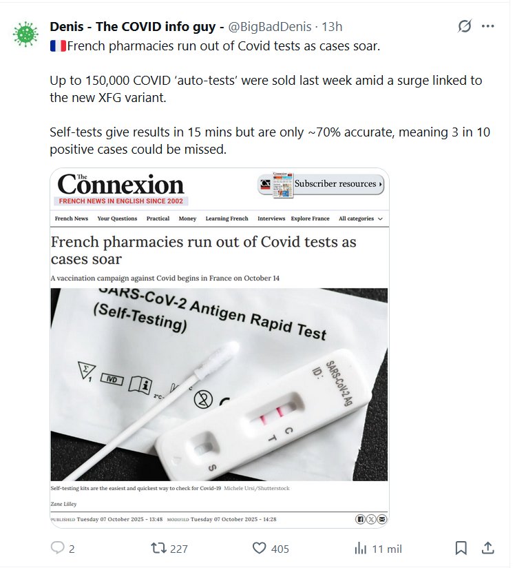 FIN DE LA SALUD PÚBLICA: TESTÉATE EN CASA DE UNA ENFERMEDAD POTENCIALMENTE MORTAL! Denis – El experto en información sobre COVID – @BigBadDenis · 🇫🇷Las farmacias francesas se quedan sin pruebas de COVID ante el aumento de casos. La semana pasada se vendieron hasta 150.000 «autotests» de COVID, en medio de un aumento repentino relacionado con la nueva variante XFG. Los autotests dan resultados en 15 minutos, pero solo tienen una precisión de aproximadamente el 70 %, lo que significa que 3 de cada 10 casos positivos podrían pasar desapercibidos.