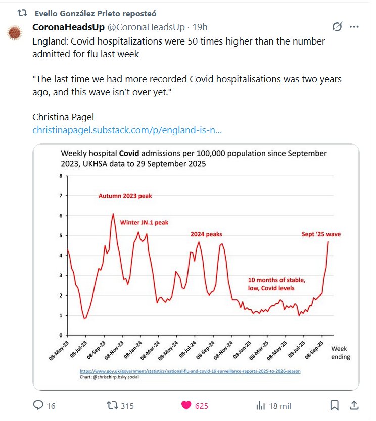 11 DE OCTUBRE DE 2025 «FIN DE PANDEMIA» El Dr. Evelio González Prieto reposteó de CoronaHeadsUp @CoronaHeadsUp · Inglaterra: Las hospitalizaciones por COVID-19 fueron 50 veces mayores que las de gripe la semana pasada. «La última vez que se registraron más hospitalizaciones por COVID-19 fue hace dos años, y esta ola aún no ha terminado.» Christina Pagel