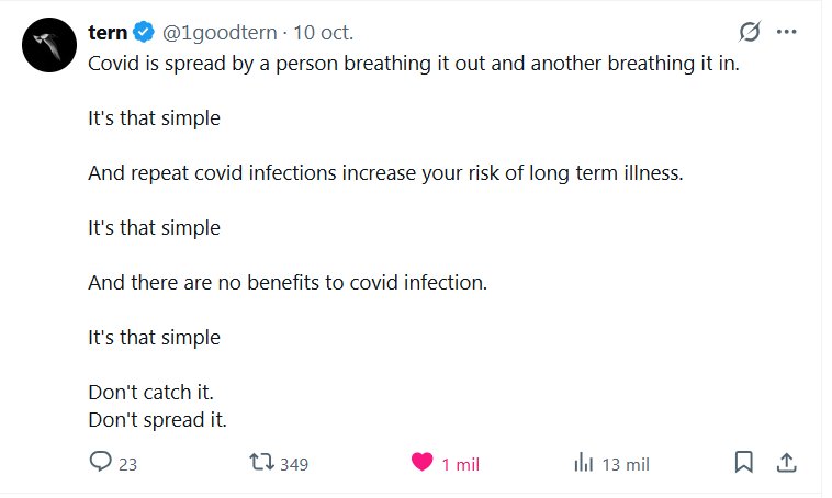 Tern @1goodtern · 10 oct. El COVID se transmite cuando una persona lo exhala y otra lo inhala. Así de simple. Y las infecciones repetidas por COVID aumentan el riesgo de enfermedad a largo plazo. Así de simple. Y no hay beneficios por la infección por COVID. Así de simple. No te contagies. No lo propagues.