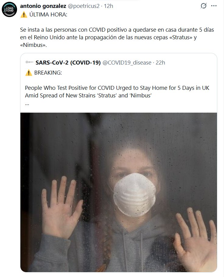«FIN DE PANDEMIA» LLEGANDO 2026 «Prof. Antonio Gonzalez @poetricus2 · ⚠️ ÚLTIMA HORA: Se insta a las personas con COVID positivo a quedarse en casa durante 5 días en el Reino Unido ante la propagación de las nuevas cepas «Stratus» y «Nimbus».