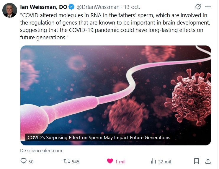 Ian Weissman, DO @DrIanWeissman · «La COVID-19 alteró moléculas del ARN en el esperma paterno, las cuales participan en la regulación de genes importantes para el desarrollo cerebral, lo que sugiere que la pandemia de COVID-19 podría tener efectos duraderos en las generaciones futuras».