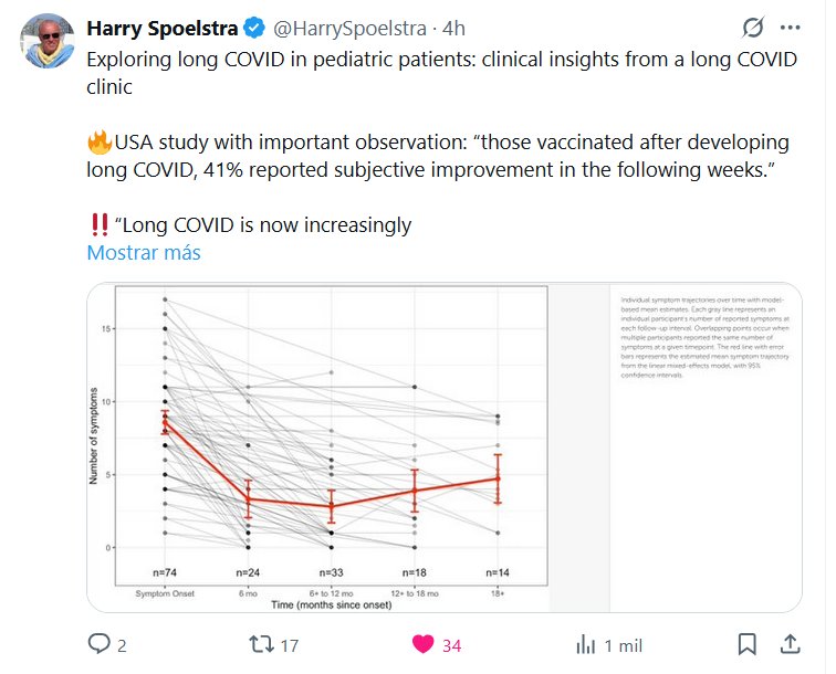 LESA HUMANIDAD DR. Harry Spoelstra @HarrySpoelstra · Explorando la COVID persistente en pacientes pediátricos: perspectivas clínicas de una clínica especializada en COVID persistente 🔥Estudio en EE. UU. con una observación importante: «El 41 % de los vacunados tras desarrollar COVID persistente reportó una mejoría subjetiva en las semanas siguientes». ‼️ «La COVID persistente se reconoce cada vez más como un problema de salud importante a largo plazo en la población pediátrica»